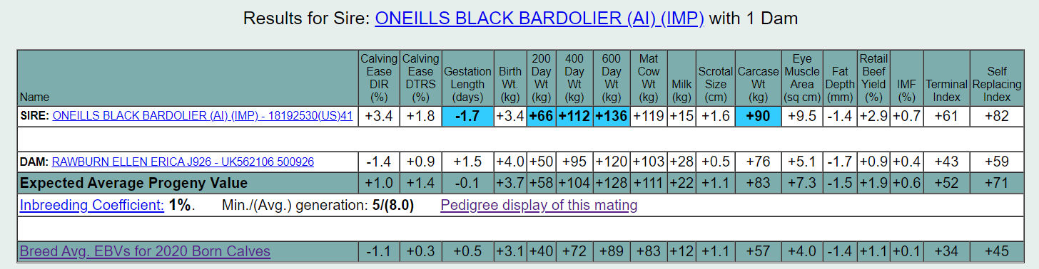 Vater, ONEILLS BLACK BARDOLIER ist der schwerste und muskulöseste Bulle, der jemals auf der O'Neill Angus Farm in IOWA USA aufgezogen wurde. Er kombiniert Wachstum mit Phänotyp und hervorragendem Fundament. Seine weiblichen Nachkommen entwickeln laut Oneill wunderschöne Euter, was uns sehr wichtig ist. Bardolier produziert leistungsstarke Kälber mit einem durchschnittlichen Gewicht von 31 – 34 kg bei ausgewachsenen USA Kühen. Bardolier´s Nachkommen haben eine sehr hohe Schlachtkörperausbeute und sehr starke Fleisch und IMF Werte, der Verfettungsgrad ist dabei sehr niedrig.