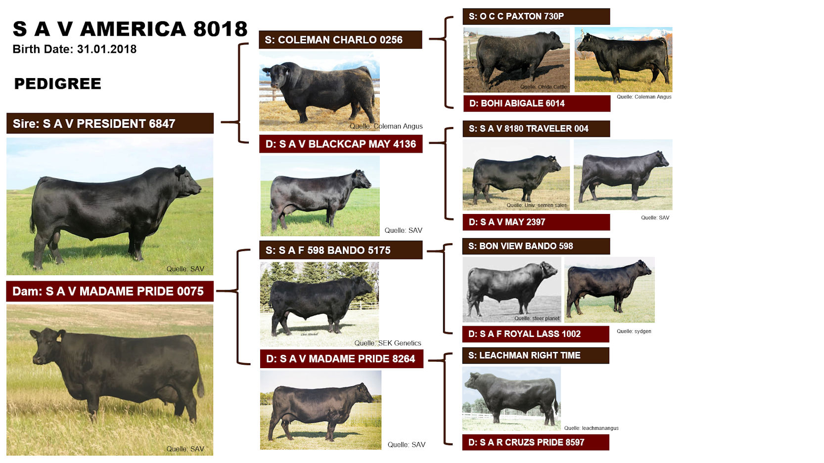 S A V America 8018 stammt aus dem letzten Embryo der legendären S A V Madame Pride 0075 und sein Vater ist S A V President 6847. America wuchs auf freier Weide in Nord Dakota auf und hatte mit 205 Tagen ein extremes Gewicht von 1.107 pounds (502 kg) und eine Tageszunahme von sagenhaften 2.200 g. Sein Jahresgewicht betrug 1.600 pounds – umgerechnet ca. 725 kg!