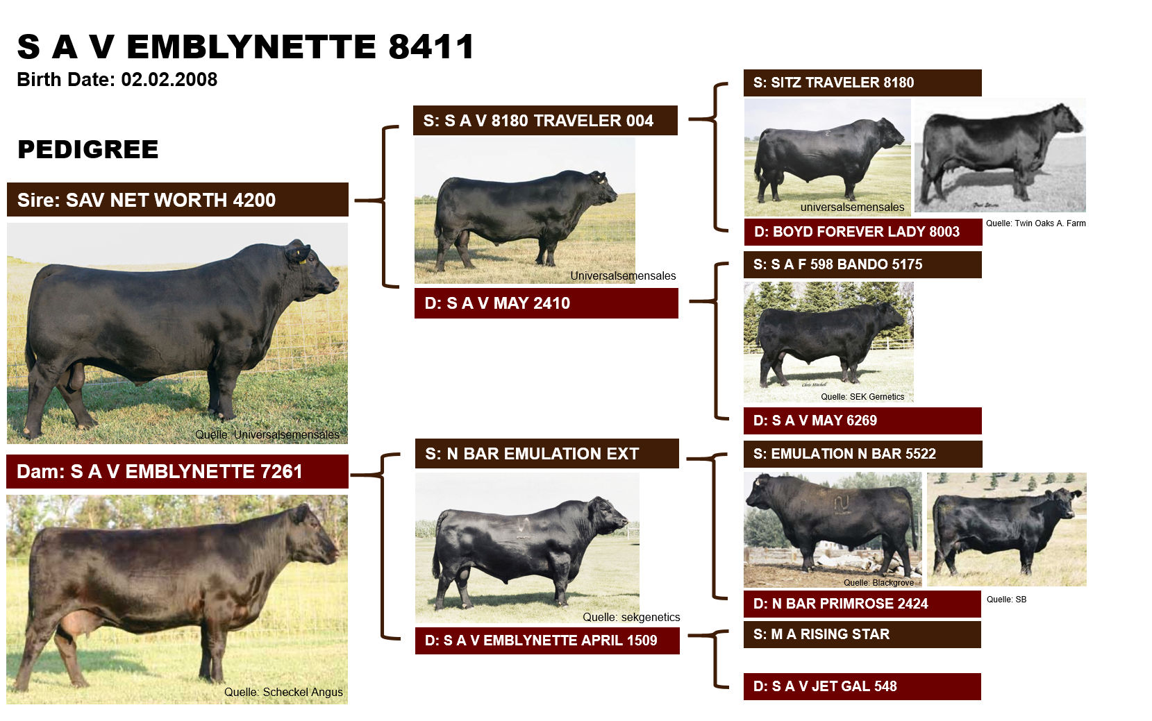 S A V EMBLYNETTE 8411 ist eine S A V Net Worth-Tochter aus S A V Emblynette 7261, welche erstaunlich lange in Produktion war.