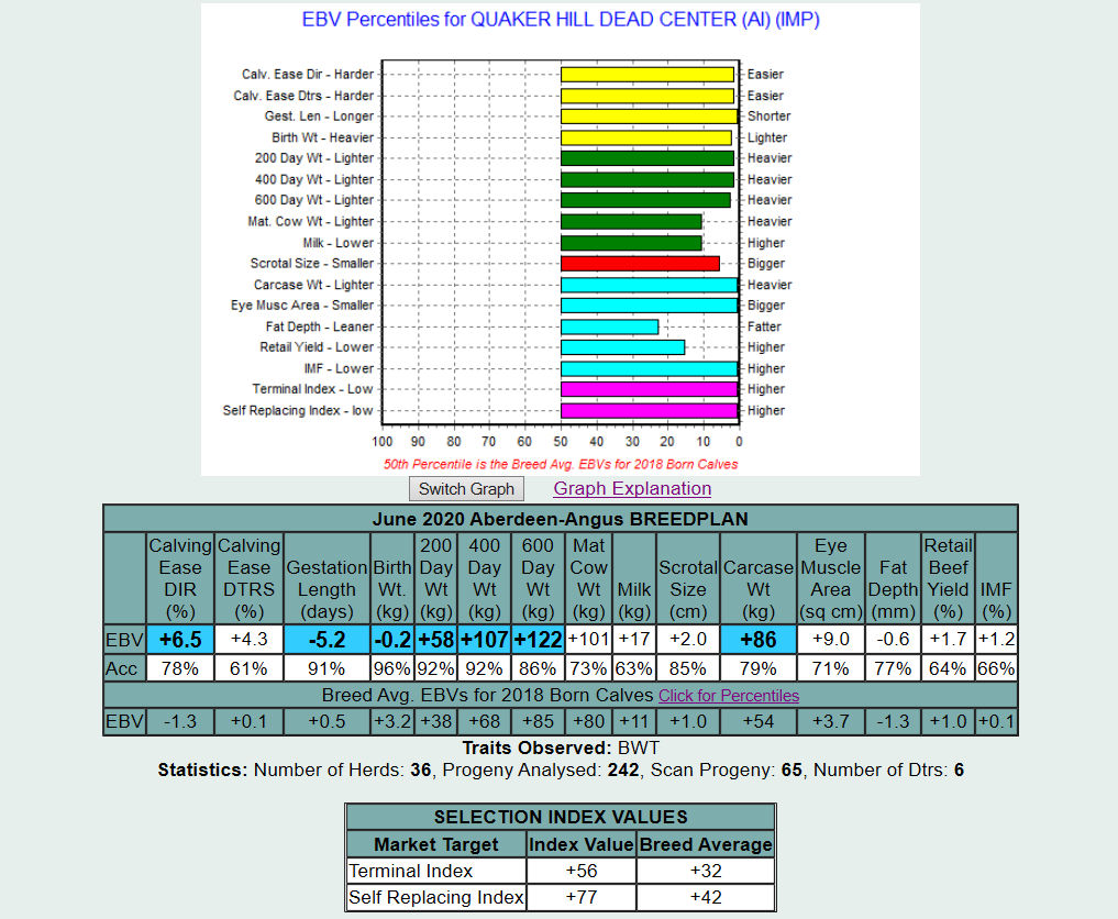 Die Mutter von Dead Center ist Quaker Hill Blackcap 0A32, eine eine besondere Angus-Kuh! Sie ist eine Vollschwester des weltberühmten ABS Global-Vererbers Quaker Hill Rampage 0A36. 0A32 hat einen dominanten Start in ihre Produktionskarriere und hat vier Söhne hervorgebracht, die bei diesen vier großen A.I. Institutionen, Select Sires, Alta Genetics, Cogent und SEMEX produzieren.