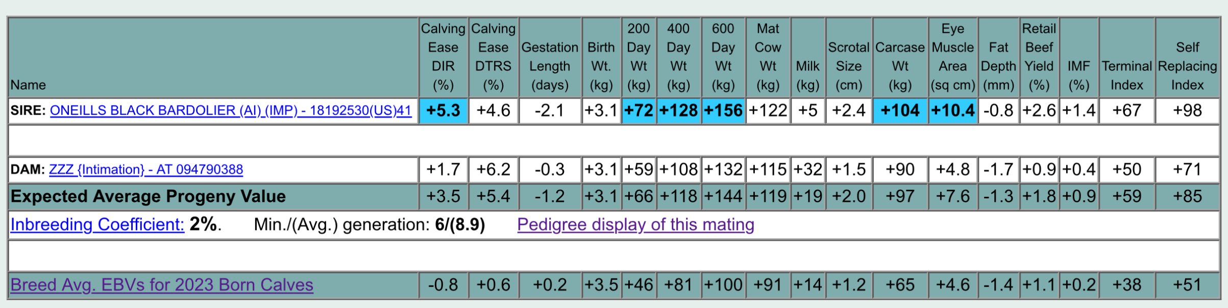 Top 1% of breed: $B +176.77, WW, YW, RADG, CW, $F, Top 2% for: RE and $W