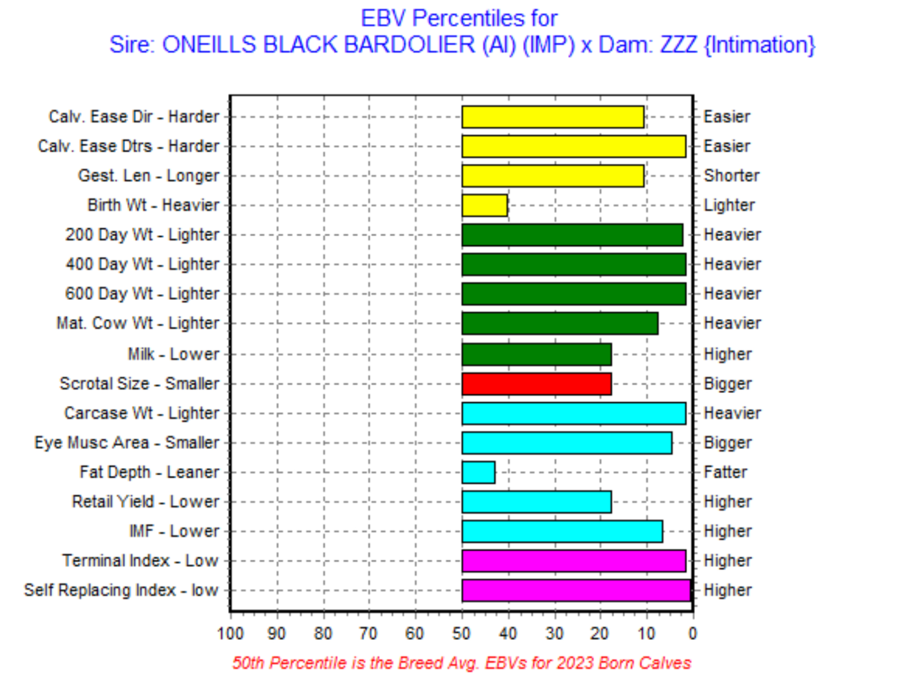 Outstanding phenotype and carcass traits. Daughters average 8.31 IMF and sons average 6.03 IMF with great calving ease and weaning heavy calves.