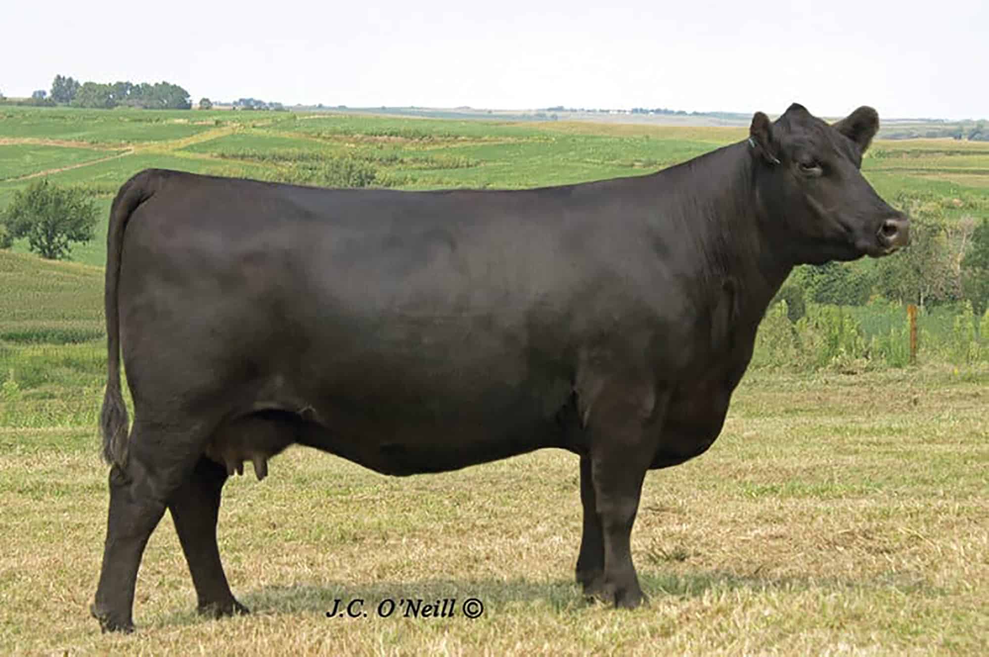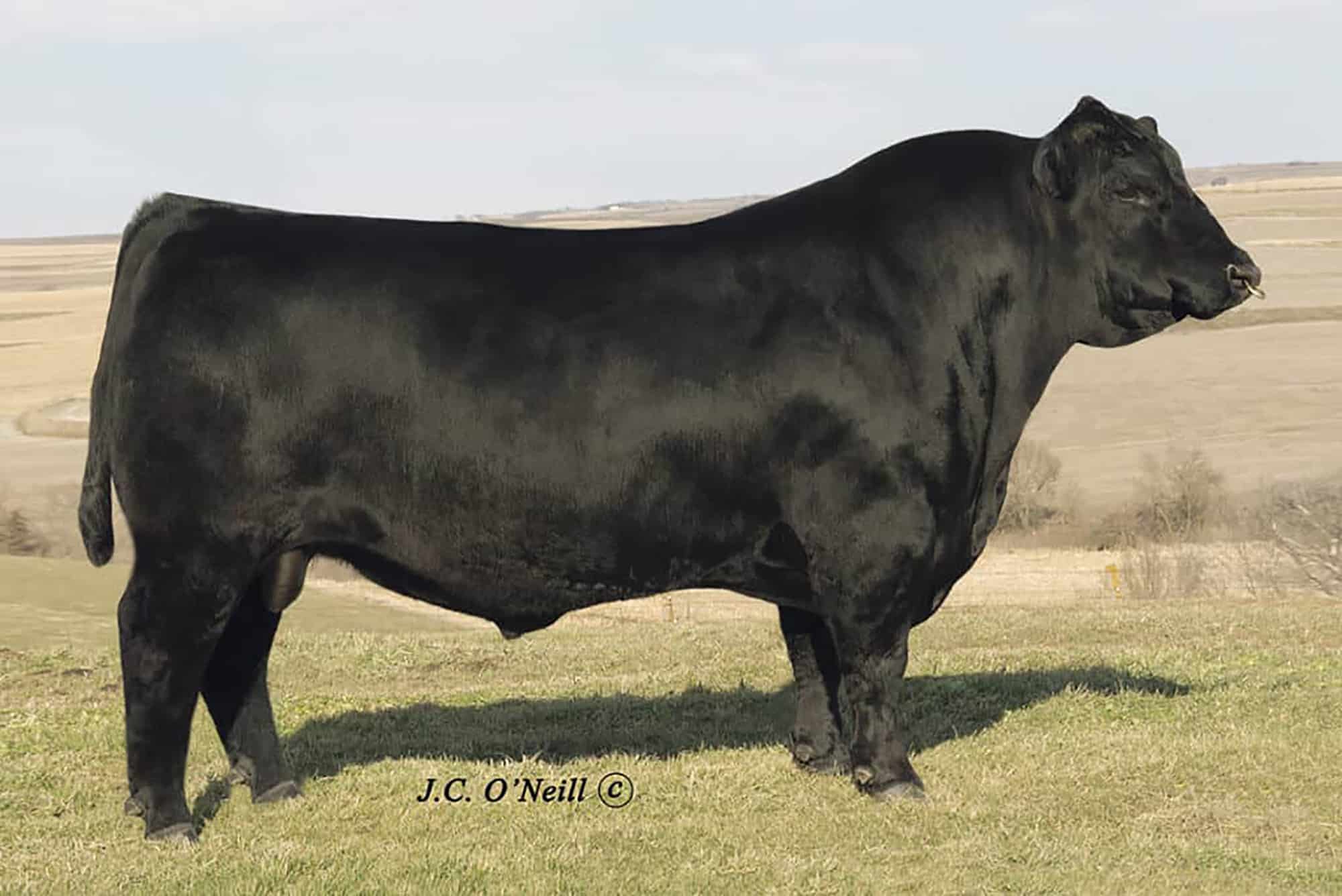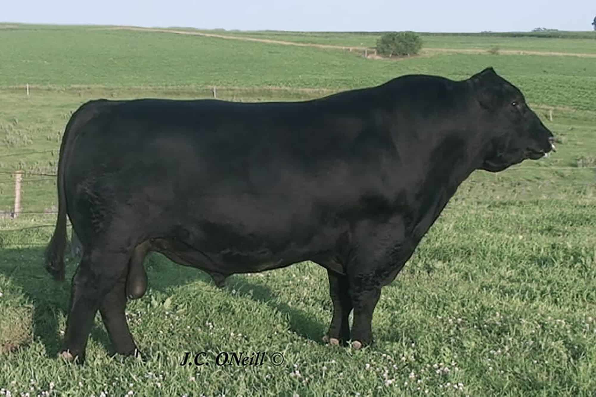 Vater, ONEILLS BLACK BARDOLIER ist der schwerste und muskulöseste Bulle, der jemals auf der O'Neill Angus Farm in IOWA USA aufgezogen wurde. Er kombiniert Wachstum mit Phänotyp und hervorragendem Fundament. Seine weiblichen Nachkommen entwickeln laut Oneill wunderschöne Euter, was uns sehr wichtig ist. Bardolier produziert leistungsstarke Kälber mit einem durchschnittlichen Gewicht von 31 – 34 kg bei ausgewachsenen USA Kühen. Bardolier´s Nachkommen haben eine sehr hohe Schlachtkörperausbeute und sehr starke Fleisch und IMF Werte, der Verfettungsgrad ist dabei sehr niedrig.