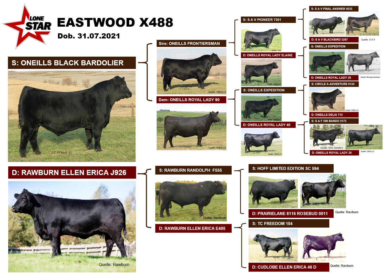 LONESTAR EASTWOOD X488 (dob 31.07.2021) ist ein Embryobullenkalb aus der erfolgreichen Spühlkuh RAWBURN ELLEN ERICA J926 mit Vater ONEILLS BLACK BARDOLIER.