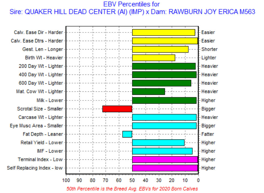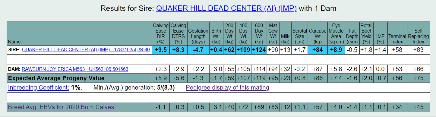 Der Vater von Quaker Hill Dead Center ist Exar Denver 2002B, ein Bulle der zwischen 2013 - 2014 in den USA alle Verkaufsrekorde verzeichnen konnte. Er war enorm beliebt bei den großen Fleischproduzenten auf Grund seiner Leichtkalbigkeit, schnellen Kälberentwicklung und vor allem wegen seiner Fleischqualität.