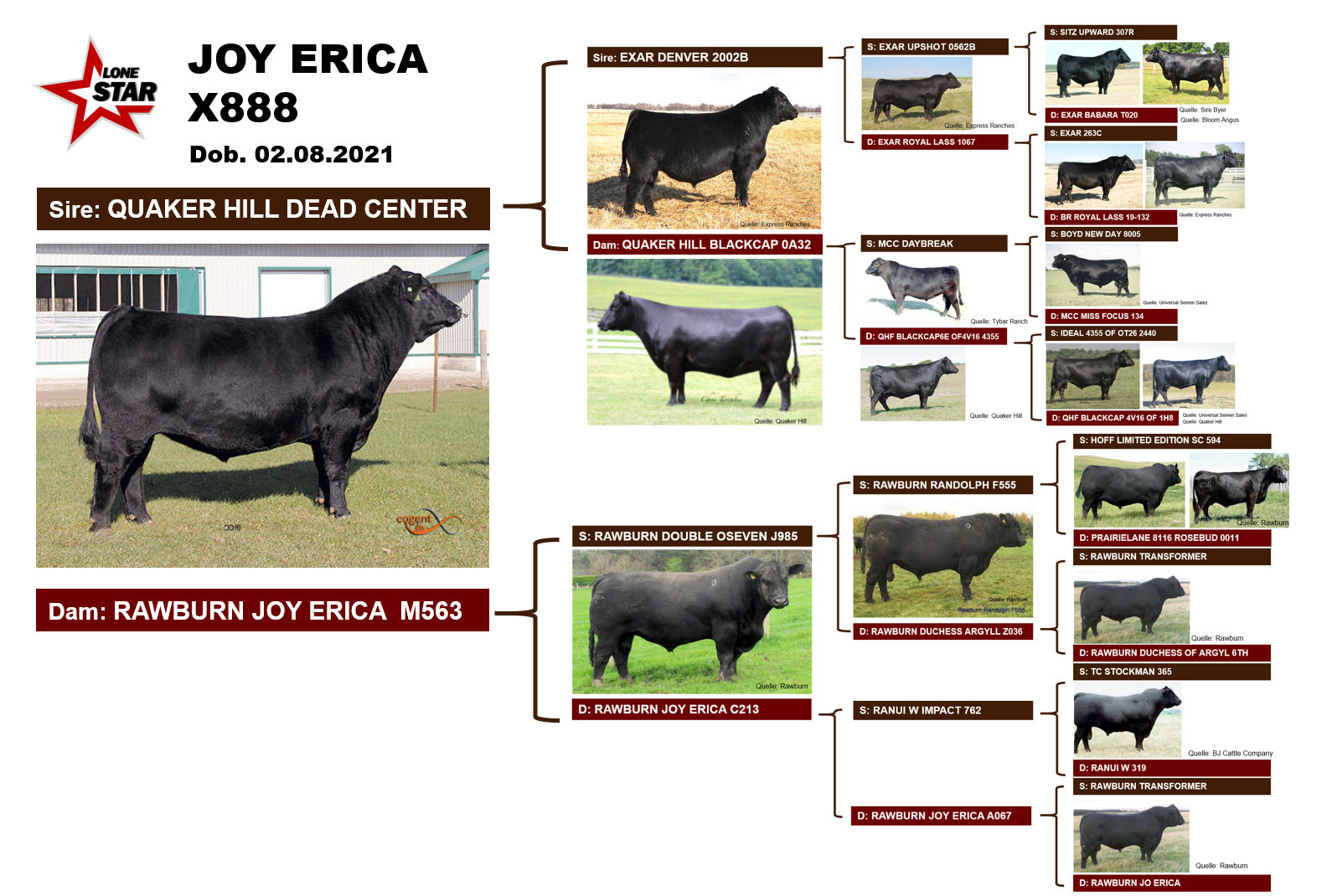 Ihr Vater ist RAWBURN DOUBLE OSEVEN J985, ein Rawburn Randolph F555 Sohn (bester Bulle bei Rawburn, Vater Hoff Limited Edition SC594) aus Rawburn Duchess Argyl Z036 (Vater Herdpatriarch Rawburn Transformer), welche in dreijähriger Folge die schwersten Nachkommen im 400 Tagegewicht bei Rawburn erzielte.